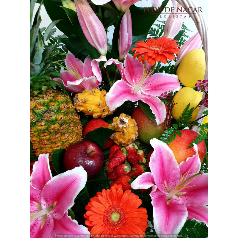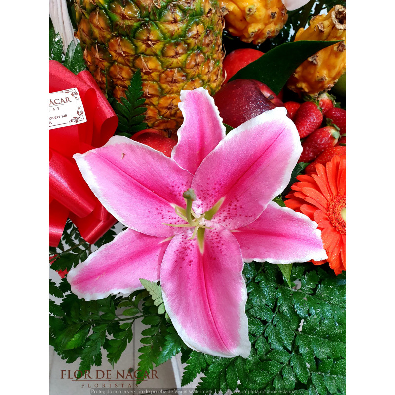 .Regalo original, Cesta de Frutas y Flores compuesta por Piña, Manzanas, Fresón, Kiwano, Mango y Flores como Lilium Oriental, Gerberas...