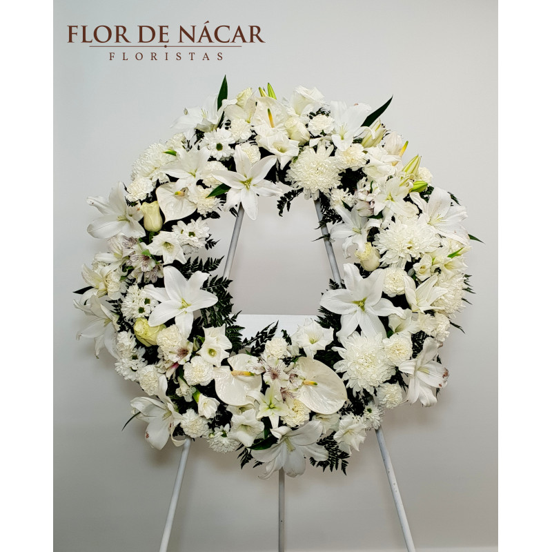 .Corona en Flor Blanca, realizada con Lilium, Margaritas, Alstroemerias, Claveles, Anthurium, Gladiolos, Crisantemos Antonov y diferentes tipos de verdes.