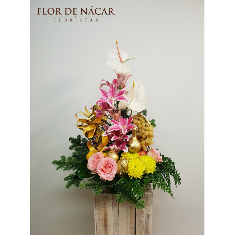 Realizada con Lilium Oriental en color Rosa, preciosas y grandes Rosas en color rosado, Crisantemo Zembla en Amarillo-Verde, elegantes Anthurium en Blanco, diferentes verdes como ramas de Abeto Nórdico, Helechos, Musgos... y como no... deliciosas Frutas Frescas como Uvas, Limones, Manzanas...